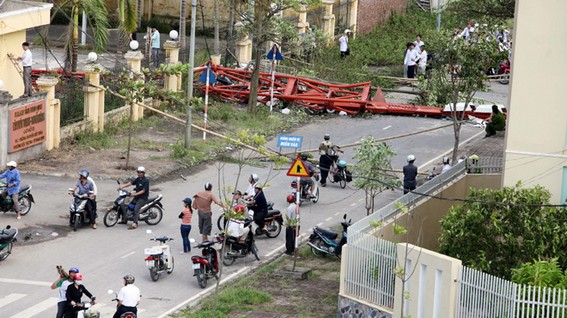 Ngọn tháp truyền hình Nam Định đổ sập vắt ngang đường - Ảnh: Việt Dũng