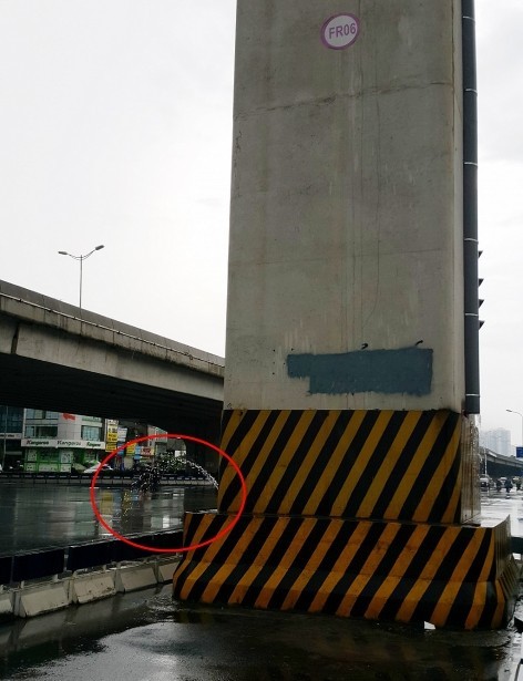 Chân của trụ cầu FR06 phun nước thành dòng khiến nhiều người đi đường bất ngờ (Ảnh Công Phương).