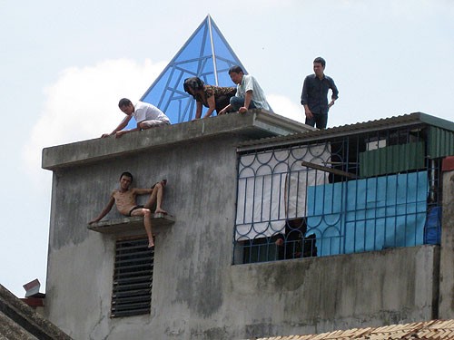 “Phê” ma túy, Nguyễn Văn Hải (SN 1982, ngụ quận Ngô Quyền - Hải Phòng) trèo lên cửa sổ tầng 4 một ngôi nhà và la hét. Ảnh: TRỌNG ĐỨC