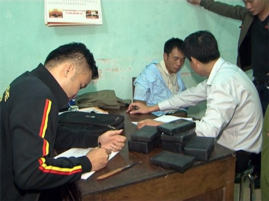 Đối tượng Sùng A Páo (áo xanh) cùng tang vật bị bắt giữa tại Mai Châu - Hòa Bình