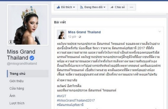 Fanpage chính thức của Miss Grand Thailand chia sẻ về sự ra đi của nàng Hoa hậu bạc mệnh. (Ảnh: (MGT)