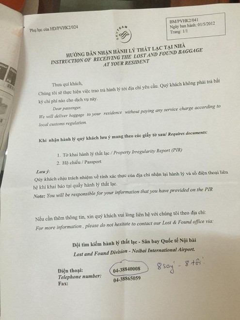 Tuy nhiên, trong tờ biên bản lại không có chữ ký của người đại diện, không có con dấu và không ghi rõ ngày nào sẽ trả lại hành lý mà chỉ nói một cách rất chung chung là: “Chúng tôi sẽ thực hiện việc trao trả hành lý tới địa chỉ yêu cầu. Quý khách không phải trả bất kỳ chi phí nào cho dịch vụ này”.