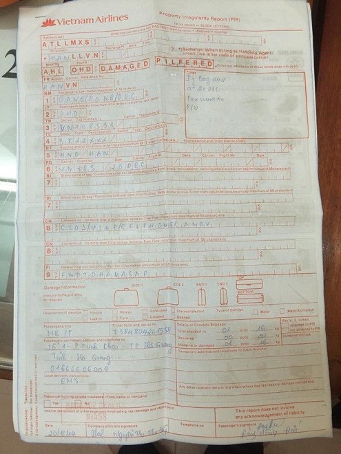 Biên bản kê khai hành lý bị thất lạc trên chuyến bay VN 385 ngày 20/12