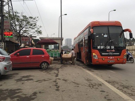 Ngoài vấn nạn xe tải chạy trong giờ cấm, lực lượng CSGT khu vực còn bị tố "làm ngơ" để để xe khách vô tư dừng đỗ, bốc dỡ hàng hóa quanh khu vực Cầu Giấy vào giờ cao điểm