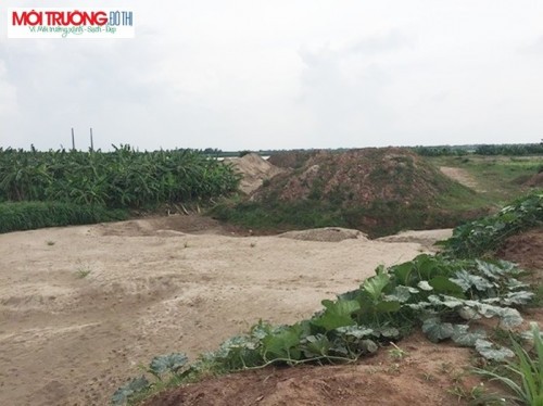 Trong khu vực khai thác đất của nhà máy, có nhiều hố được lấp bằng cát, theo người dân cát này được hút lên từ sông Hồng, một số điểm khác các hố đã khai thác được vùi rác thải ở dưới, cát được lấp phủ phía trên.