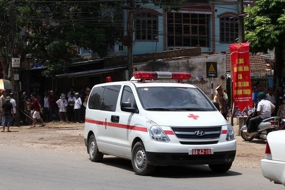 Xe cứu thương đưa nạn nhân đi cấp cứu. (Ảnh: Doãn Tấn/TTXVN)