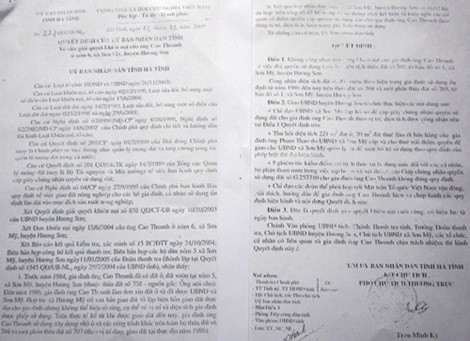 Năm 1986, gia đình ông Cao Thoanh ở xóm 6, xã Sơn Mỹ, huyện Hương Sơn (Hà Tĩnh) được chính quyền giao một thửa đất ở và đất vườn, thể hiện trên bản đồ gồm thửa đất 703 với diện tích 630m2 và thửa 704. Ông Thoanh nói gia đình đã thực hiện đầy đủ các loại phí, thuế, sản lượng cho nhà nước. Đến năm 1994 được UBND xã Sơn Mỹ đề nghị UBND huyện Hương Sơn cấp GCNQSDĐ số G: 257710 cấp 1994 mang tên Cao Thoanh, thửa đất 703 với diện tích 630m2.