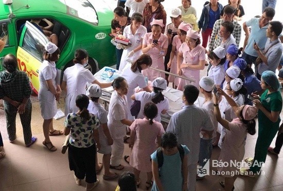 Taxi vừa đến, các y bác sĩ nhanh chóng có mặt giúp gia đình sản phụ. Ảnh: BVĐK 115 NA cung cấp