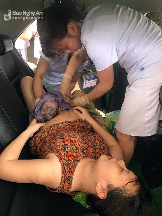 Các nữ hộ sinh Bệnh viện Đa khoa 115 Nghệ An cắt rốn cho em bé ngay trên xe taxi. Ảnh: BVĐK 115 NA cung cấp.