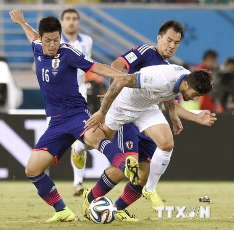 Cầu thủ Panagiotis Kone (phải) đội tuyển Hy Lạp, tranh bóng quyết liệt với các cầu thủ đội tuyển Nhật Bản trong trận đấu ở bảng C. (Nguồn: Kyodo/TTXVN)