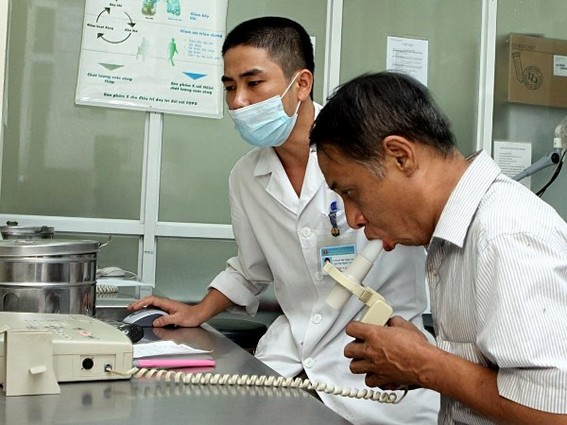 Cán bộ y tế đo chức năng hô hấp cho người bệnh. (Ảnh: TTXVN)