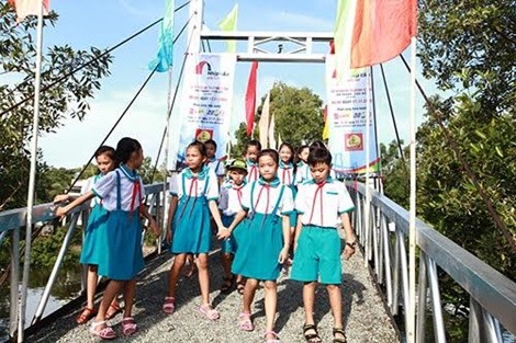 Các em học sinh trường tiểu học Tân Lập tung tăng trên cây cầu thép dây văng
