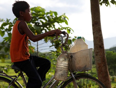 Em học sinh lớp 4 ở thôn 3, xã Thượng Nhật đi lấy nước phụ giúp cha mẹ.