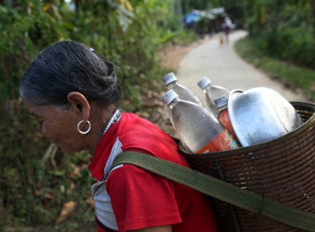 Bà Hồ Thị Trắc 75 tuổi ở thôn 3, xã Thượng Nhật giúp con cháu bằng việc đi lấy nước mỗi ngày 3 lần cho gia đình 5 người.