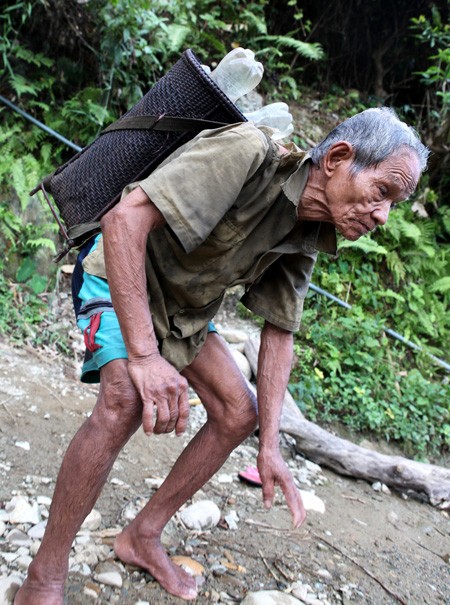 Ông Tà Rường Đề 83 tuổi ở xã Thượng Nhật đi liêu xiêu với hơn 10 lít nước gùi từ suối về.