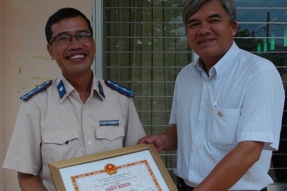 Ông Lê Việt Cường, Chánh Văn phòng Ban an toàn giao thông tỉnh An Giang trao giấy khen cho anh Phan Trọng Hải. (Ảnh: Công Mạo/Vietnam+)