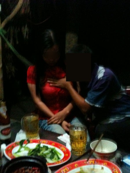 Sau vài lần uống cạn ly bia, Hoa và Duyên xin phép chúng tôi “chạy sô” qua những chòi nhậu kế bên và qua khe hở của chòi lá, hình ảnh đập vào mắt chúng tôi là hai tiếp viên Hoa, Duyên cùng 2 cô gái khác đang ngồi lọt thỏm trong lòng của khách, còn đôi tay của vị khách cứ tha hồ “đùa giỡn” trên cơ thể các cô và những âm thanh, ngữ điệu thô tục cũng phát ra từ đó. Mới 7 giờ 30 tối mà hơn chục căn chòi trong quán đã đông nghẹt khách. Mỗi khách đều được một tiếp viên chăm sóc… chu đáo đến “giật mình”