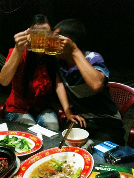 Chưa kịp ổn định “vị trí”, một cô tiếp viên khác đã khệ nệ khuâng ngay vào chòi một két bia Sài Gòn đỏ và hỏi: “Mấy anh có gọi tiếp viên quen không, hay là tụi em phục vụ? Mấy anh chọn món nhậu đi, em nói bà chủ làm luôn”, vừa nói cô vừa đon đả rút chiếc khăn lạnh lau mặt cho khách.