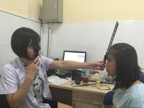 Khám mắt, đo thị lực cho một bệnh nhân lứa tuổi học sinh tại Bệnh viện Mắt Trung ương. Ảnh: T.Nguyên