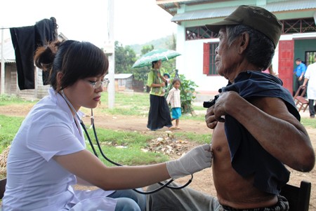 Cán bộ y tế xã xuống tận bản khám chữa bệnh cho đồng bào.