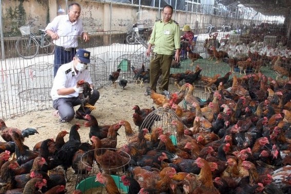 Lực lượng chức năng liên ngành kiểm tra, giám sát gia cầm sống tại chợ buôn bán gia cầm. (Ảnh: TTXVN)
