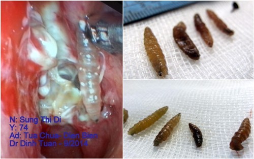 Ngày 11/9/2014, bà Sùng Thị Dí (74 tuổi) ở bản Tào Cù Nhè, xã Sính Phìn, huyện Tủa Chùa, tỉnh Điện Biên đến Bệnh viện Đa khoa tỉnh Điện Biên để khám bệnh với các triệu chứng bị chảy mũi kéo dài và đau nhức vùng mũi xoang. Sau khi khám, các bác sỹ vô cùng sửng sốt khi phát hiện thấy rất nhiều giòi sống lúc nhúc trong mũi bà cụ.