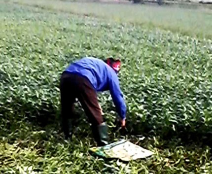 Gặp một phụ nữ đang “tắm” nhớt thải cho rau muống, chúng tôi liền tiếp cận và dò hỏi thử. Không hề giấu diếm và e ngại, người này nói: “Tưới như thế để giảm bớt được tình trạng bị sâu rầy phá hoại”. Sau đó, chị này còn tiết lộ cách thức tưới nhớt cho rau muống: “Từ thời điểm rau vừa cắt còn gốc thì phải tưới nhớt pha mua ở tiệm sửa xe với nước rửa chén để xử lý các con rầy trên ruộng. Dụng cụ phun tưới cũng rất đơn giản, những người trồng rau chỉ cần một chiếc xô, một cái ca nhựa. Ra ruộng thì chỉ cần múc đầy nước dưới ruộng vào xô rồi cho nhớt thải, nước rửa chén vào quậy đều và “tạt” xuống vựa rau…”.