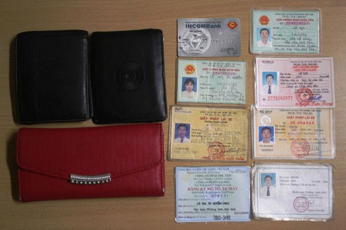Ngoài ra, trong quá trình tác nghiệp, chúng tôi nhặt được 3 chiếc ví do các đối tượng móc túi sau khi lấy hết tiền bỏ lại. Trong đó, 1 ví màu đen bên trong có 1 thẻ BHYT mang tên Lê Lợi (SN 1995, tổ 1, phường 6, Tuy Hòa - Phú Yên), 1 giấy đăng ký xe máy, 1 CMND mang tên Lê Thị Út Huyền (SN 1983, ngụ Tuy Hòa - Phú Yên). Chiếc ví màu đen khác có 1 giấy phép lái xe mang tên Nguyễn Văn Hải (SN 1991, huyện Tân Phú - Đồng Nai) và 1 giấy đăng ký xe máy do Nguyễn Văn Tùng làm chủ. Ví nữ màu hồng có CMND, giấy phép lái xe, thẻ rút tiền ACB… mang tên Nguyễn Thị Thanh Hương (SN 1989, ngụ Châu Thành - Long An).