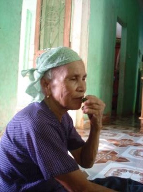 Mệ Quyết đang "mằn" vào miếng trầu.