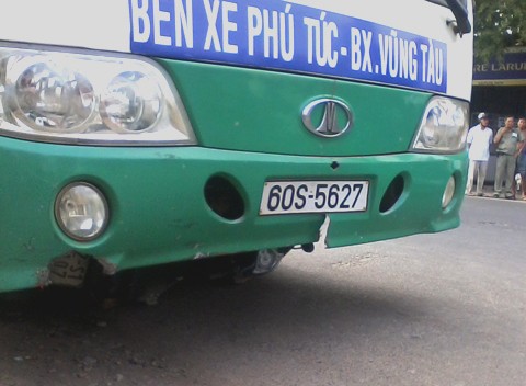 Khoảng 14h30 chiều 9.11, xe buýt chạy tuyến Vũng Tàu - Long Khánh chở gần 30 hành khách đi trên đường 30/4 (TP Vũng Tàu) hướng ra thị xã Bà Rịa. Đến trước tiệm tạp hoá số 876 (phường 11, TP Vũng Tàu), chiếc buýt đụng phải xe máy do 2 thanh niên chạy cùng chiều phía trước.