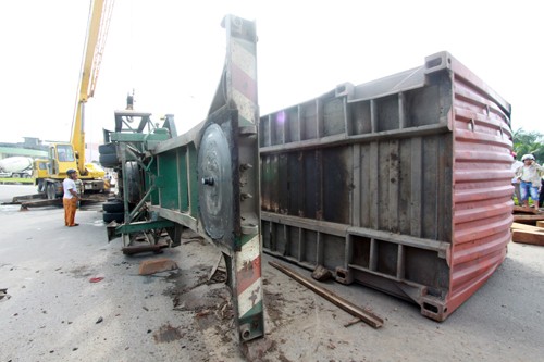 Do cua gấp, phần rơ moóc bất ngờ lật ngang, khiến cả rơ moóc và thùng xe đập xuống mặt đường, rất may vào thời điểm trên không có người và phương tiện lưu thông bên cạnh xe đầu kéo nên không có thương vong.