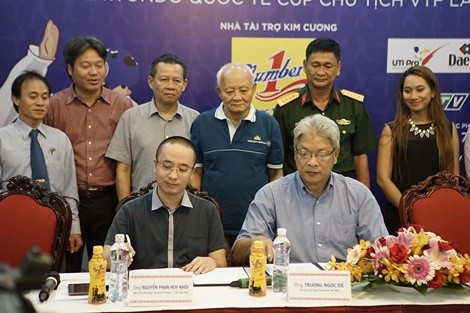 Ông Nguyễn Phan Huy Khôi - Giám đốc Đối ngoại Tập đoàn Tân Hiệp Phát và ông Trương Ngọc Để - Chủ tịch Liên đoàn Taekwondo Việt Nam ký kết hợp đồng tài trợ