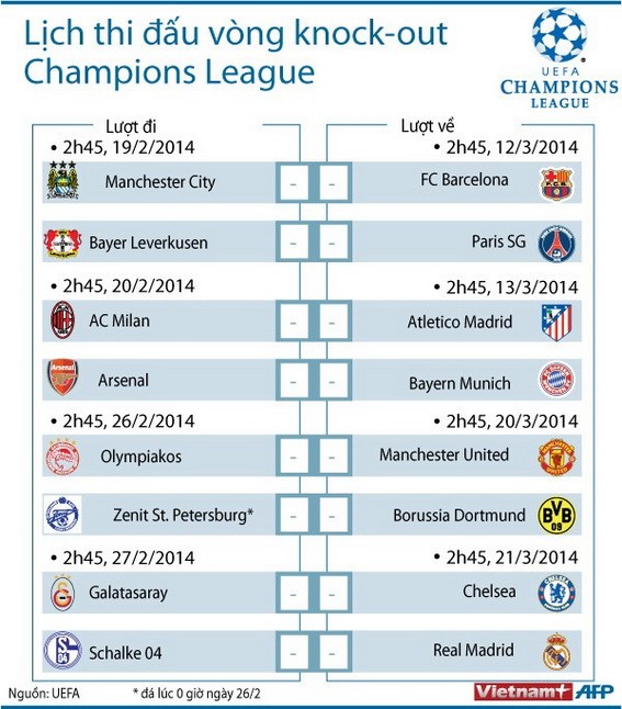 Các trận lượt đi vòng knock-out Champions League sẽ diễn ra vào ngày 19, 20, 26 và 27/2/2014, các trận lượt về sẽ tổ chức vào ngày 12, 13, 20 và 21/3/2014.