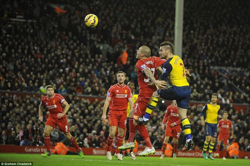 Hậu vệ Debuchy của Arsenal đánh đầu gỡ hòa cho Pháo thủ ở ở phút cuối cùng hiệp 1