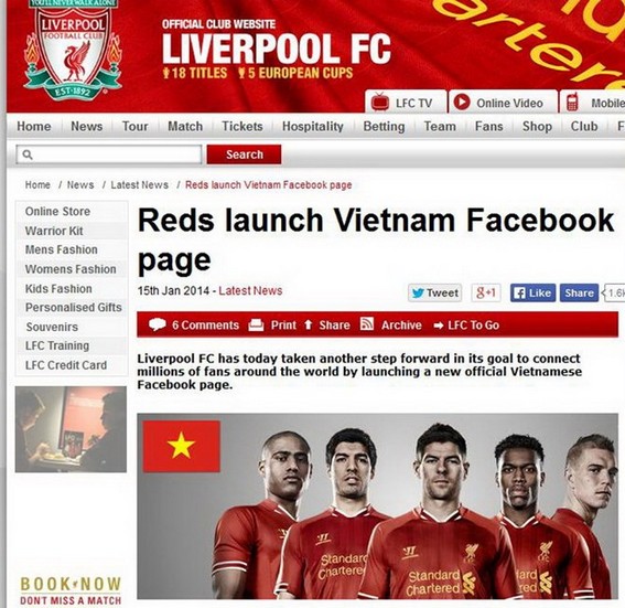 - Trang chủ của câu lạc bộ Liverpool đã ra thông báo chính thức về việc cho ra mắt phiên bản tiếng Việt trên trang Facebook của đội bóng chủ sân Anfield.