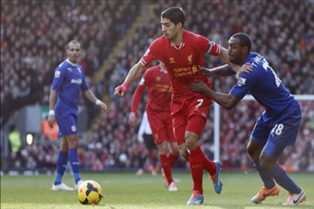 Trở lại sau chuỗi trận bị treo giò vì hành vi cắn tay Ivanovic trong trận đấu với Chelsea cuối mùa bóng trước, Suarez đang thể hiện một phong độ hủy diệt với 21 bàn thắng, một mình độc chiếm ngôi vua phá lưới giải bóng đá ngoại hạng Anh. Tính trên bình diện châu Âu, sau trận đấu với Cardiff City, Suarez còn là cầu thủ dẫn đầu danh sách đoạt danh hiệu “Chiếc giày vàng” trong mùa bóng này.
