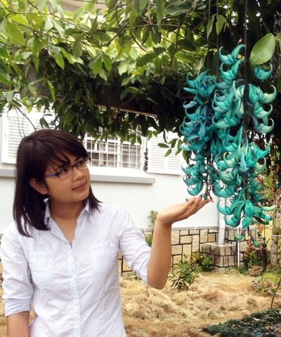 “Vì chồng tôi hợp với màu trắng nên tôi chỉ chọn sắc hoa này để tăng vượng khí nơi sinh sống và cầu mong mọi điều may mắn cho anh ấy” - TS Mai nói. Tuy nhiên có một loài hoa màu xanh đã lạc vào biệt thự hoa trắng ấy. Đó là hoa móng cọp xanh với tên khoa học Strongylondon macrobotrys.