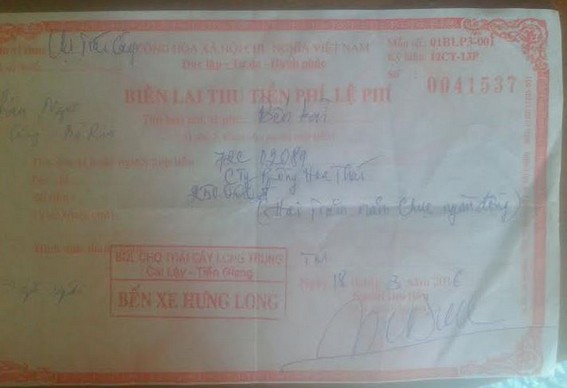 Biên lai thu lệ phí tại chợ trái cây Long Trung