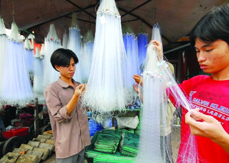 Thanh niên ở xã Nhơn Hưng (Tịnh Biên, An Giang) chuẩn bị lưới để săn bắt cá, tôm.