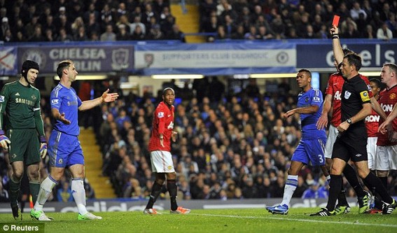 Phút 62, The Blues chỉ còn lại 10 người trên sân khi Ivanovic bị trọng tài Mark Clattenburg truất quyền thi đấu do truy cản trái phép với Ashley Young trong tình huống M.U phản công nhanh cực kỳ nguy hiểm. Sau tình huống này, Rooney thực hiện pha đá phạt đưa bóng vọt xà ngang.
