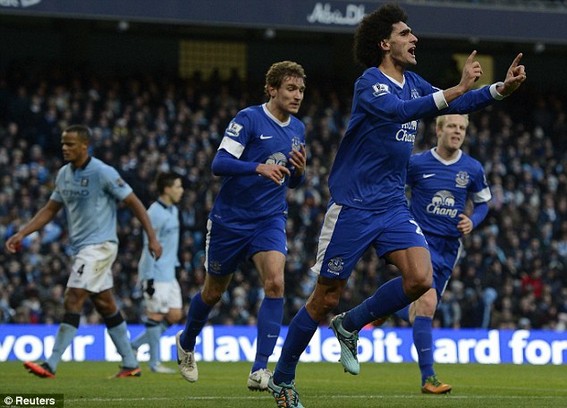 Phút 33, các khán đài sân Etihad như chết lặng khi Baines tạt bóng từ bên cánh phải vào trong vòng cấm cho Fellaini bật cao đánh đầu buộc thủ môn Joe Hart phải trổ tài cản phản. Tuy nhiên, ở pha dứt điểm bằng… đầu gối sau đó, Fellaini đã không cho người gác đền bên phía Man City một cơ hội cản phá.