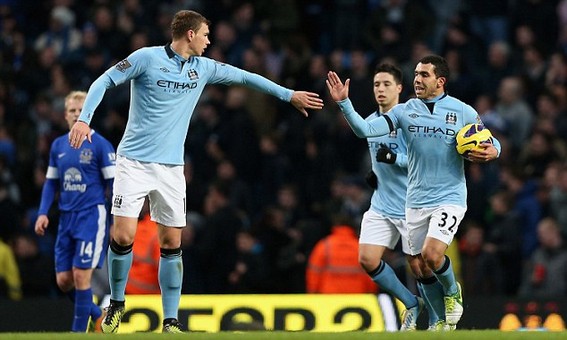 Đang tấn công bế tắc, Man City bất ngờ được hưởng quả penalty ở phút 42 sau khi tiền vệ Fellaini bên phía Everton kéo ngã Dzeko trong vòng cấm. Trên chấm 11m, Tevez dễ dàng đánh lừa thủ thành Tim Howard, quân bình tỷ số 1-1 cho Man City.