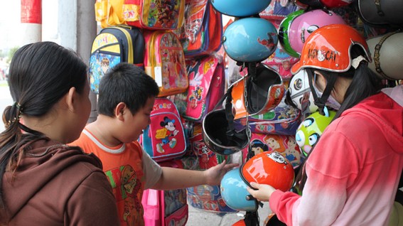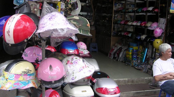 Mũ bảo hiểm dỏm được bày bán trên đường Nguyễn Trãi, Q.1, TP.HCM tối 26-12.