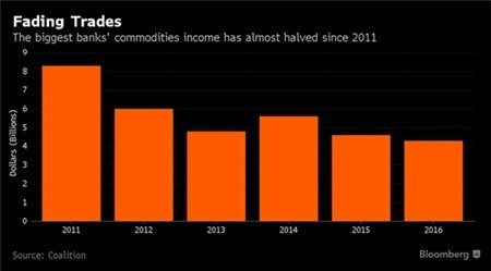 Theo Coalition, doanh thu hàng hóa của các ngân hàng lớn đã giảm xuống mức thấp nhất trong 11 năm vào năm 2016. Trong quý I năm nay, theo Coalition ước tính,doanh thu kinh doanh hàng hóa trong ngành ngân hàng đã giảm xuống còn 800 triệu USD, - giảm 29% so với năm 2016 và chưa bằng 1/3 so với mức của năm 2012.