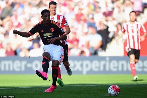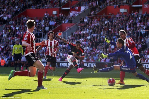 Đang có được lợi thế dẫn trước, hàng thủ của Southamton đã sơ sểnh để M.U ghi bàn gỡ hoà. Phút 34, hậu vệ Yoshida phá bóng đúng ngay chân Martial. Tân binh người Pháp tận dụng tốt cơ hội dứt điểm, làm tung lưới thủ thành Stekelenburg, gỡ hoà 1-1 cho Quỷ đỏ. Bàn thắng của Martial cũng có phần may mắn khi Mata đã ở vào thế việt vị trước đó nhưng trọng tài không thổi phạt.