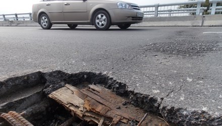 Mặt cầu Đường 5 kéo dài bị trơ lõi gỗ ép (Ảnh Tiền Phong).