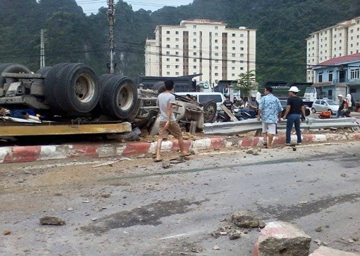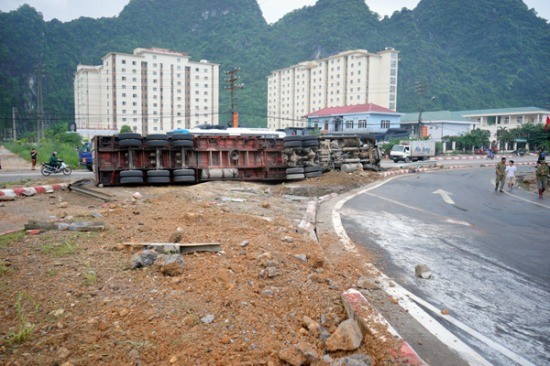 Theo đó, chiếc xe đầu kéo BKS 15C-045.68 kéo theo rơ-moóc BKS 16R-4769 thuộc công ty TNHH Vận tải XNK TA (125 Lê Thánh Tông, Ngô Quyền, Hải Phòng) khi đang di chuyển từ đường tránh Hạ Long xuống quốc lộ 18 thì bị mất lái, lật ngang xuống đường.