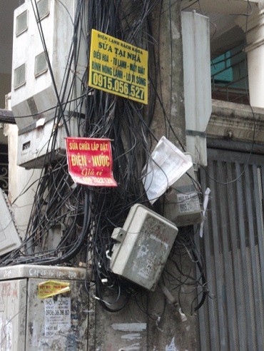 Những mớ dây điện đã thấy nguy hiểm và ghê sợ giờ "cõng" thêm tờ rơi treo lủng lẳng. Bước ra cửa nhà là thấy "phấp phới" trên không, đôi khi cũng gây ra bức xúc cho mọi người dân xung quanh.