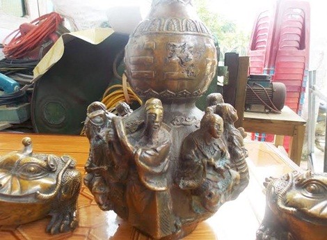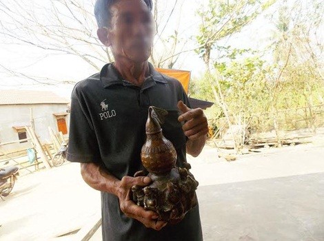 “Nói rồi 2 thanh niên bảo vừa mới đào được một bình hồ lô lạ có hình 8 ông tiên và 2 con cóc ba chân to bằng nắm tay. Giá ban đầu họ đưa ra là 14 triệu đồng, nhưng cuối cùng họ chấp nhận bán cho tôi với giá 4 triệu đồng. Lúc đó tôi không biết đó là cái gì, chỉ biết nó lạ và được bôi bùn lên trông như đồ cổ mới đào được nên vợ chồng tôi mua” – ông Tài thuật lại.