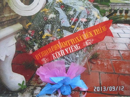 Bó hoa “hiếu”phản cảm tại lễ tang liệt sĩ Lăng được Phó Chủ tịch xã Nguyễn Văn Đường xác nhận là của cấp chính quyền xã Tiến Thắng. Ảnh:M.A